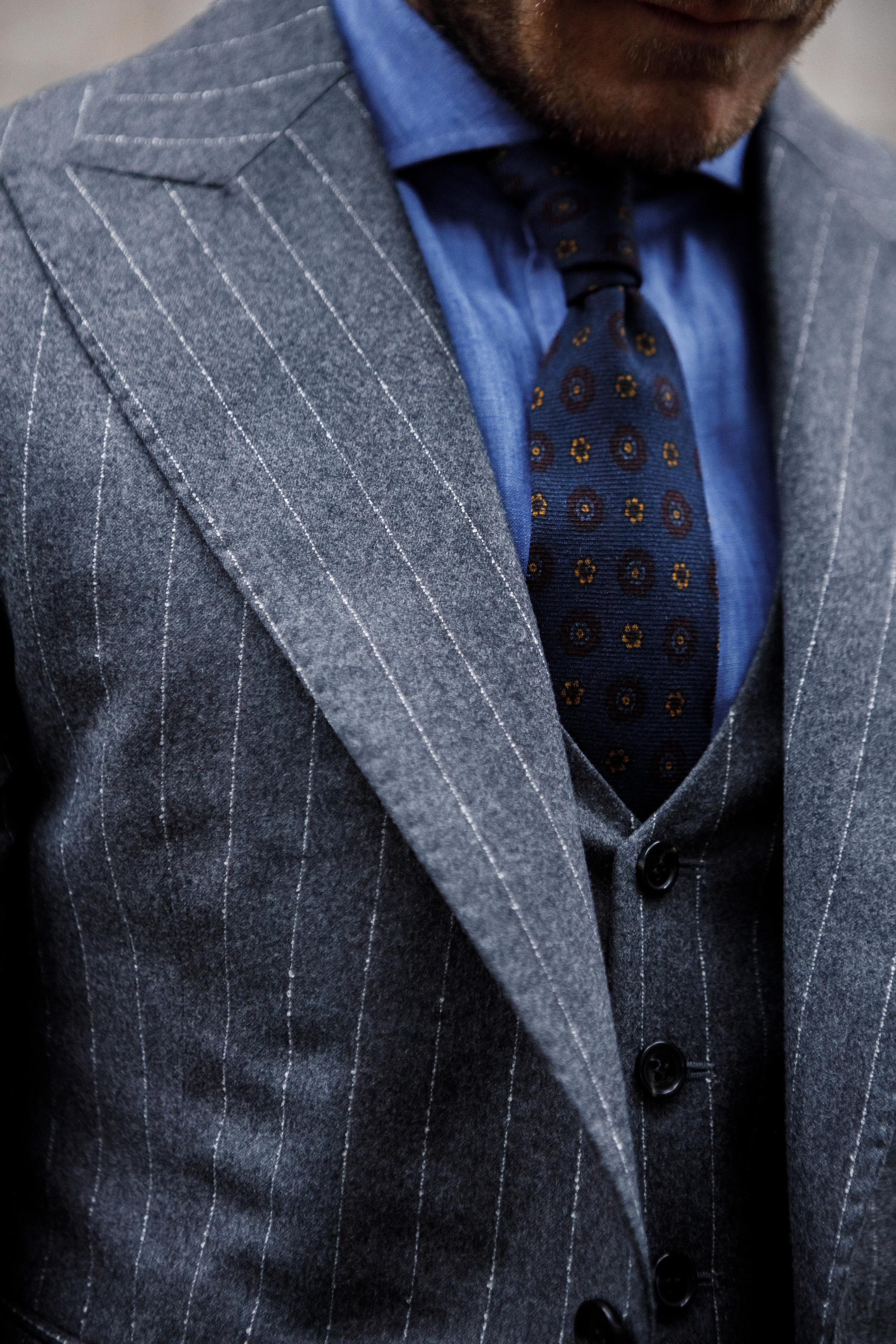 Идеальный серый костюм – это костюм-тройка в масштабную серую буклированную полоску, конечно же, из 100% шерсти от итальянской мануфактуры StylBiella.