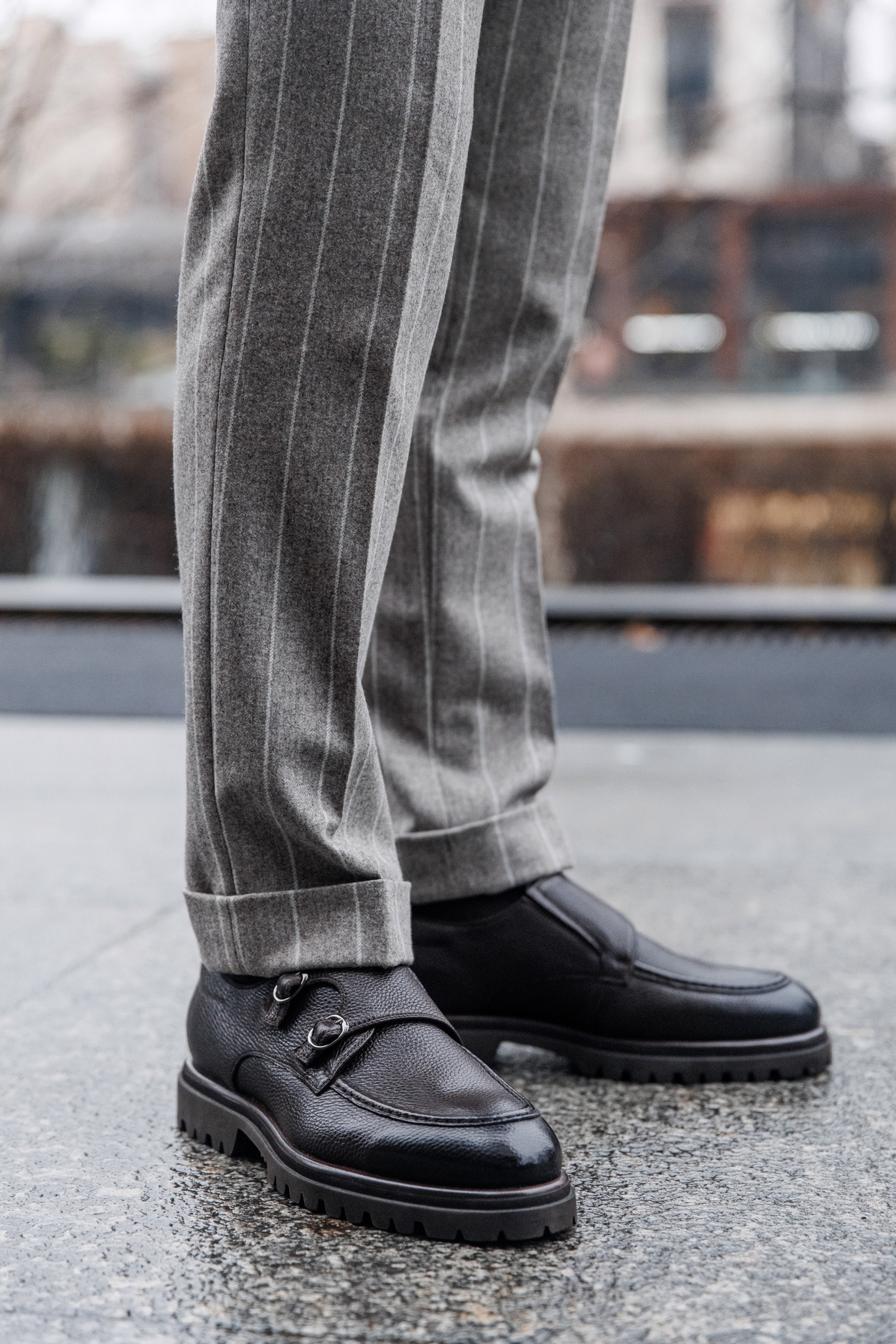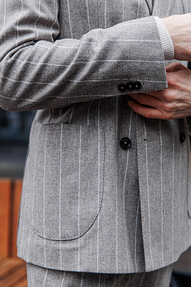 Костюм из ткани итальянского бренда Styl Biella с выразительной, масштабной полоской. Накладные карманы, пиковый лацкан, брюки с манжетами и защипами формируют собранный, актуальный и элегантный силуэт. Когда костюм — это про вкус, а не про скучные правила.