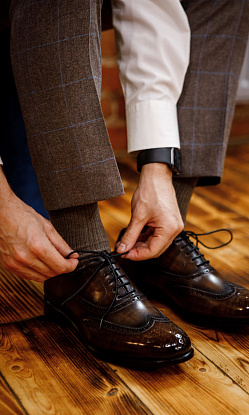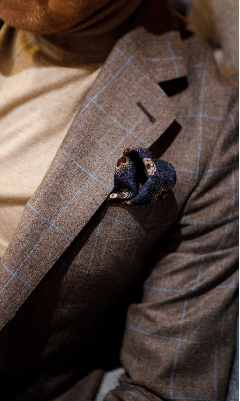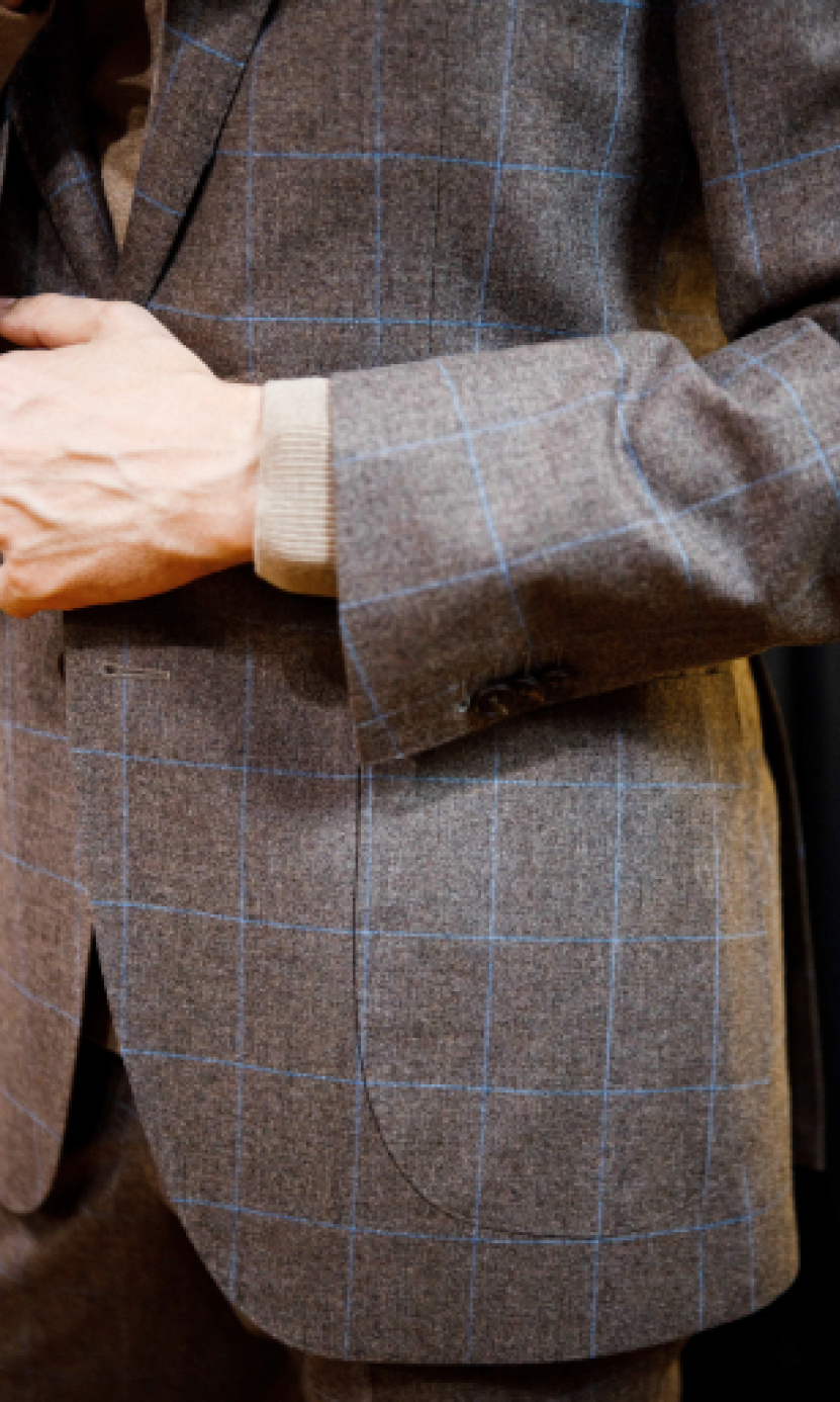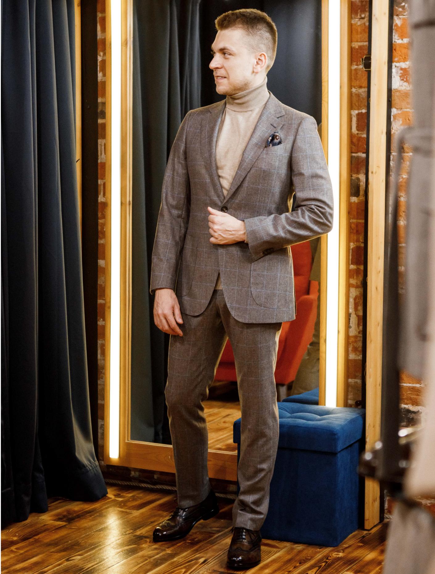 Костюм-двойка теплого благородного серого оттенка в крупную клетку из мягкой фланели итальянской мануфактуры StylBiella – универсальный вариант для любого сезона.