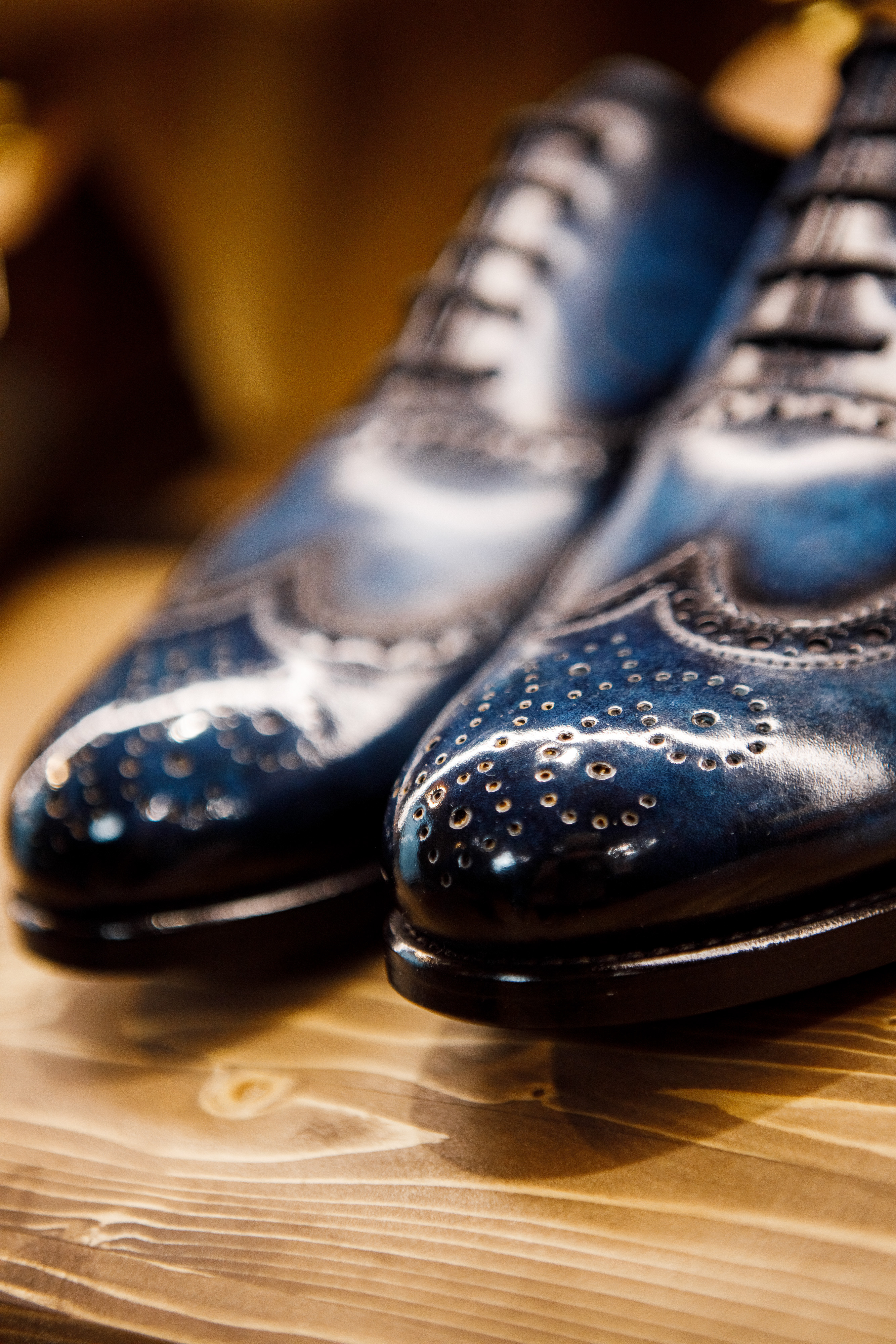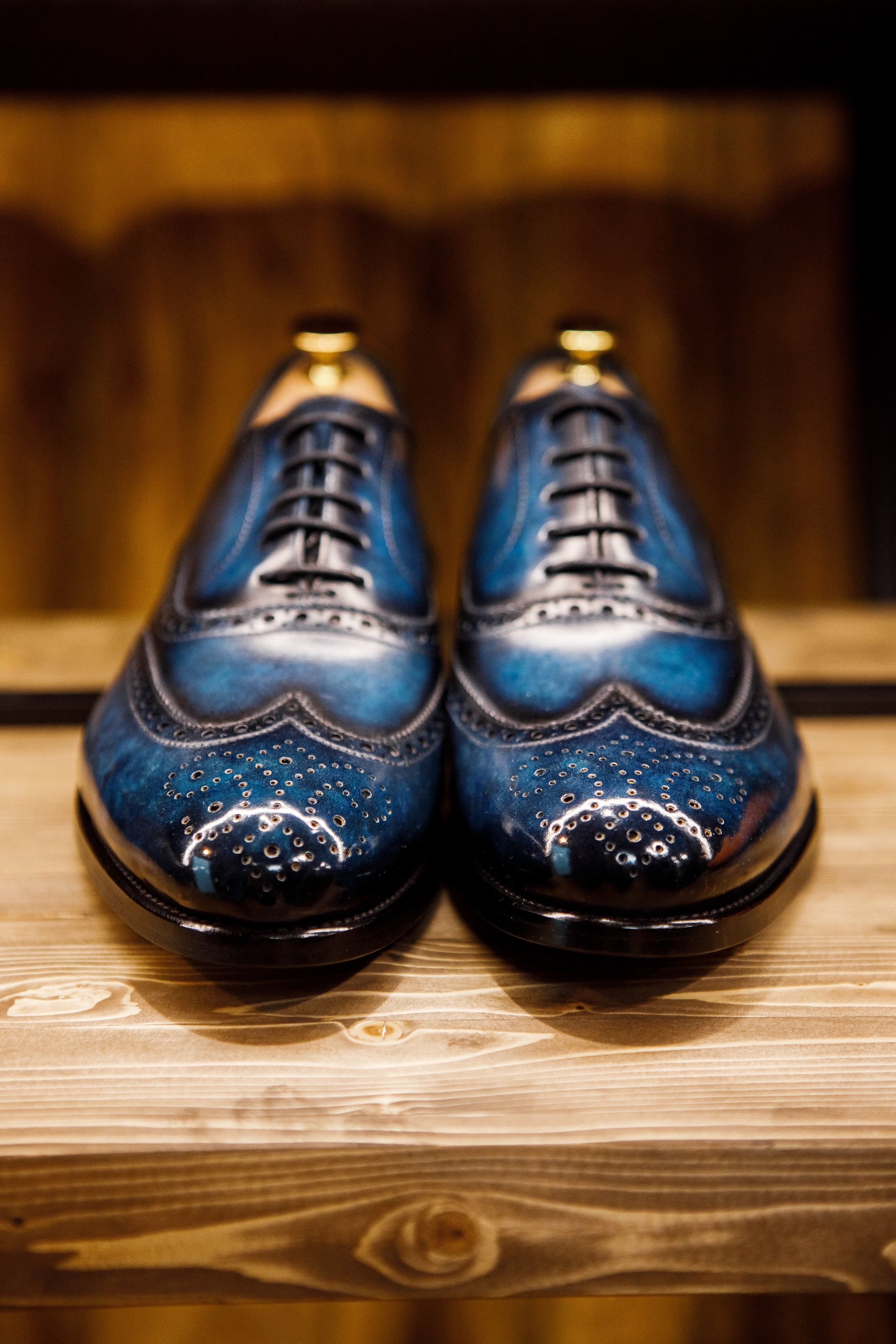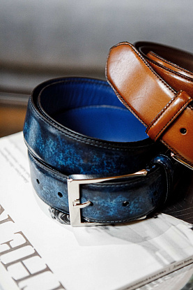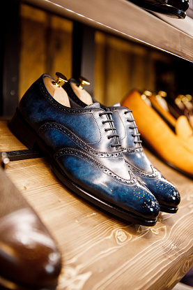 Броги из гладкой кожи с оригинальной патиной интенсивного синего оттенка. Ремень в цвет выкраса вашей пары – для нас нет ничего невозможного!