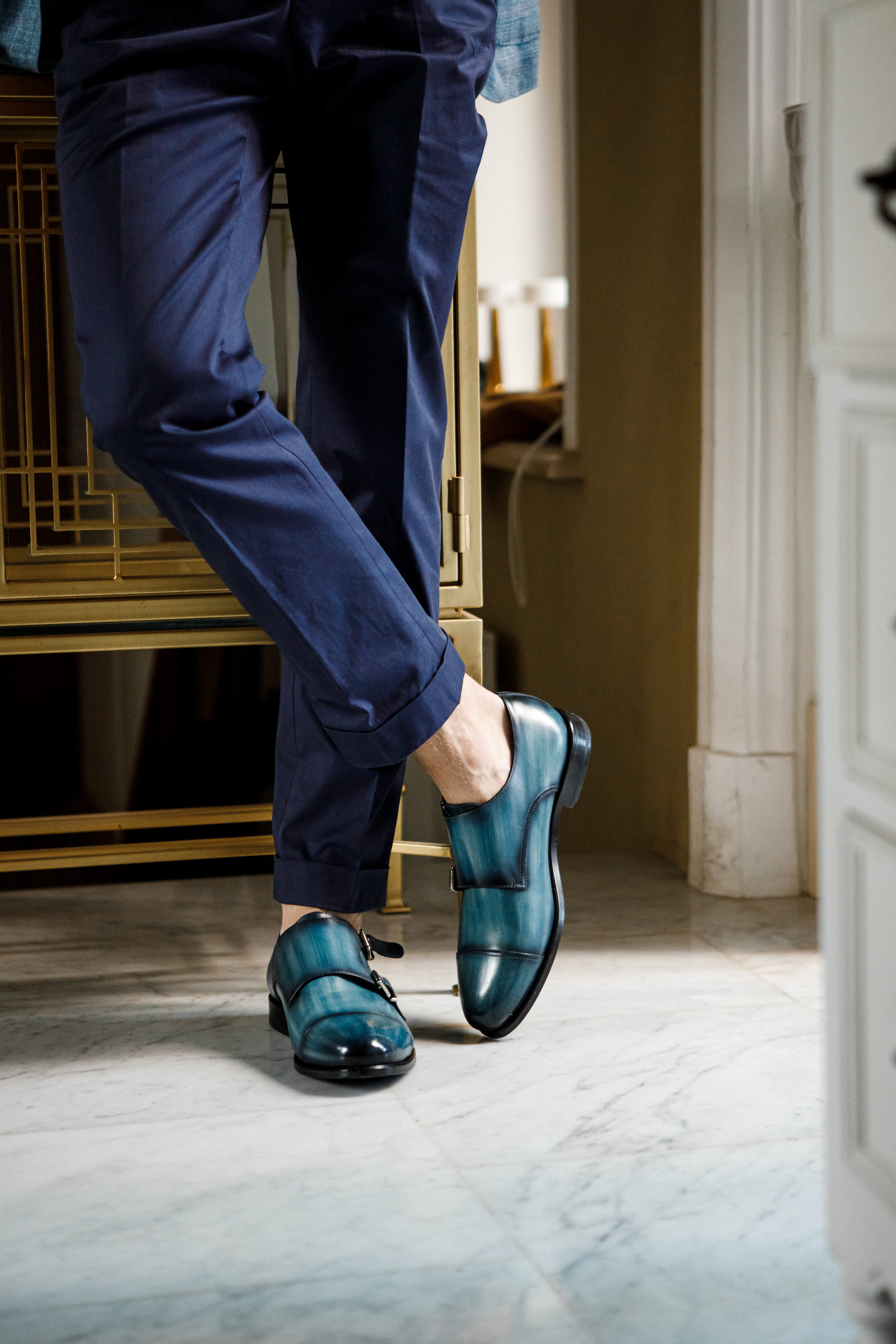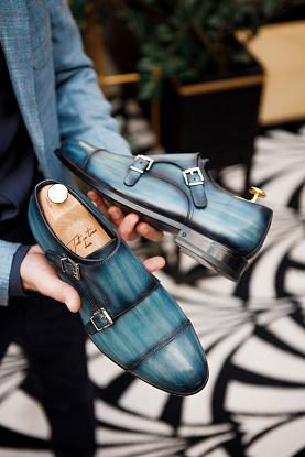 Двойные монки цвета "индиго" из гладкой кожи в ручном окрасе, глассаж в качестве финишной обработки - закажите такую же или создайте свой индивидуальный дизайн.