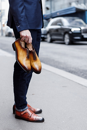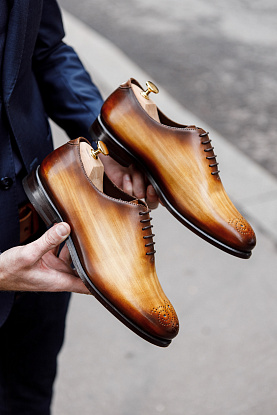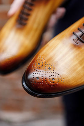 Оксфорды в ручном интенсивном окрасе с оттенками коньяка, глассаж в качестве финишной обработки – пришло время расширить границы классики.