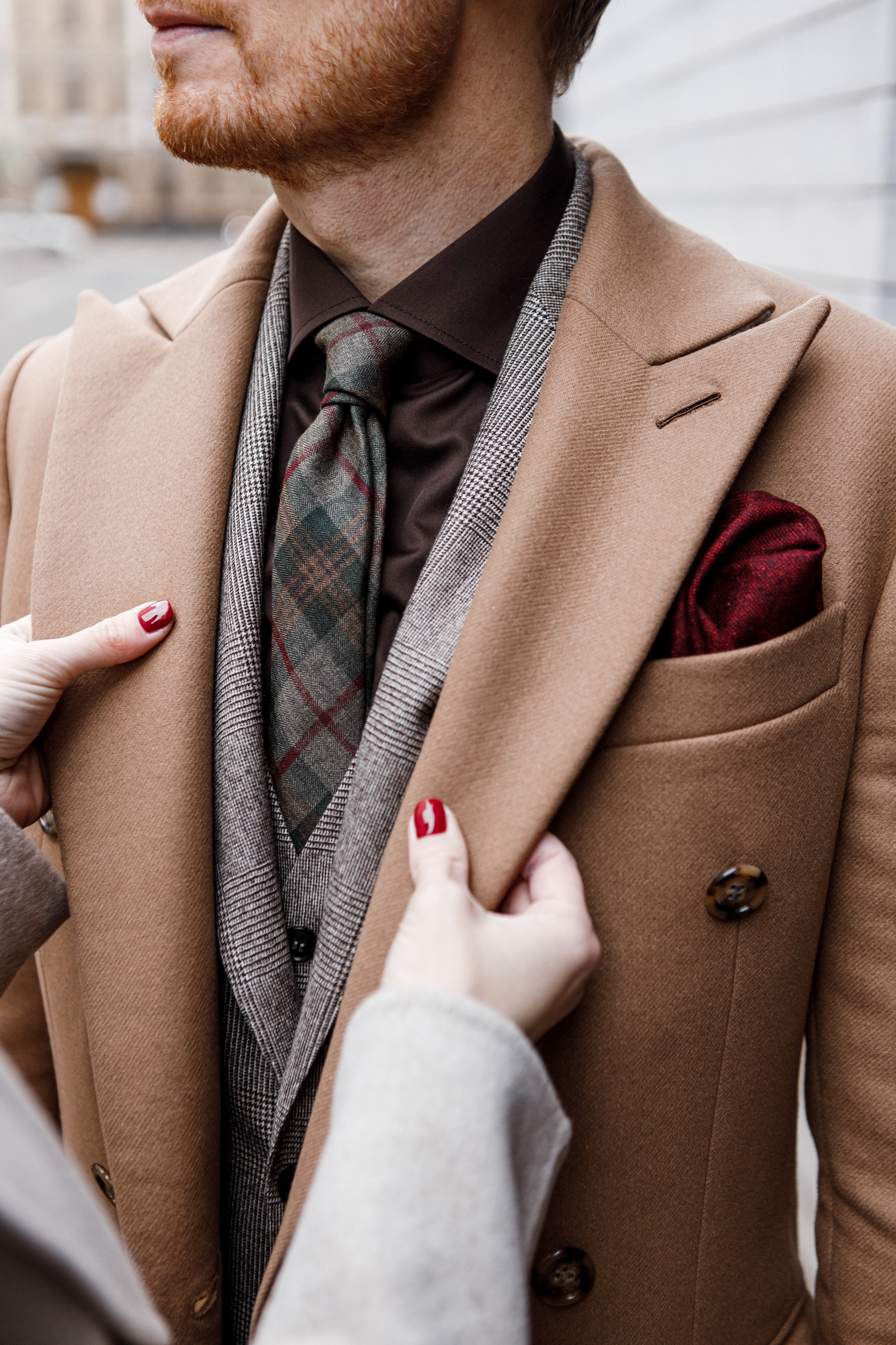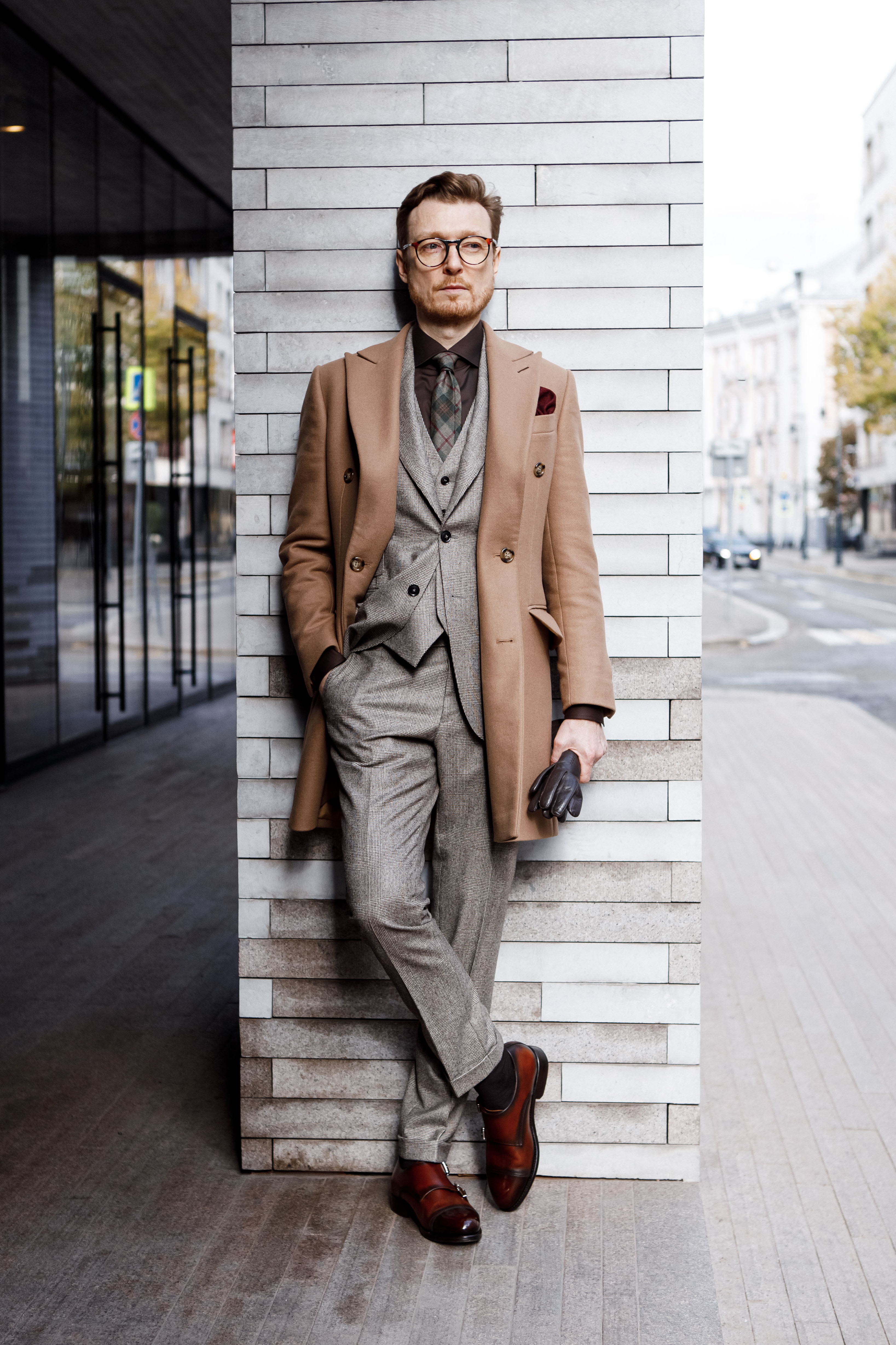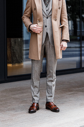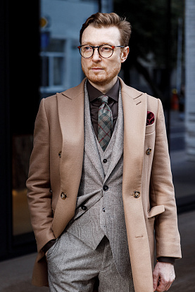 Классическое двубортное пальто песочного оттенка – беспроигрышный вариант как в составе строгого образа, так и в сочетании с джинсами и трикотажем.