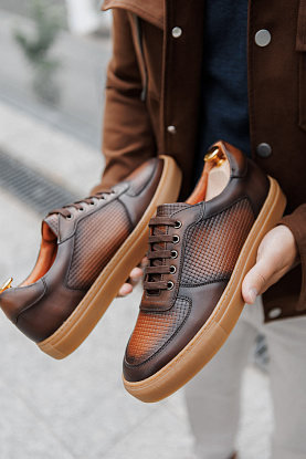 Роскошные сникеры глубокого коньячного оттенка со сложным градиентом и изысканным тиснением. Контрастная подошва цвета карамели гармонично дополняет верх пары и придаёт практичности. Универсальность, эстетика и стиль соединяются здесь с комфортом спортивной обуви.