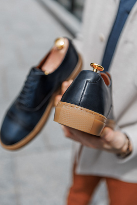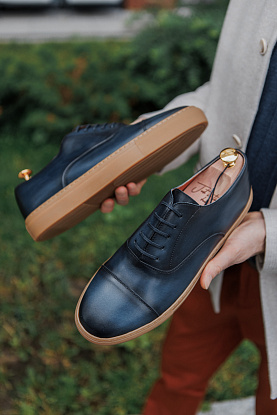 Сникеры в самой консервативной интерпретации, стилизованные под классические оксфорды с отрезным носком. Верх выполнен из гладкой телячьей кожи глубокого синего оттенка, а контрастная подошва цвета карамели добавляет акцент и повышает практичность в эксплуатации.