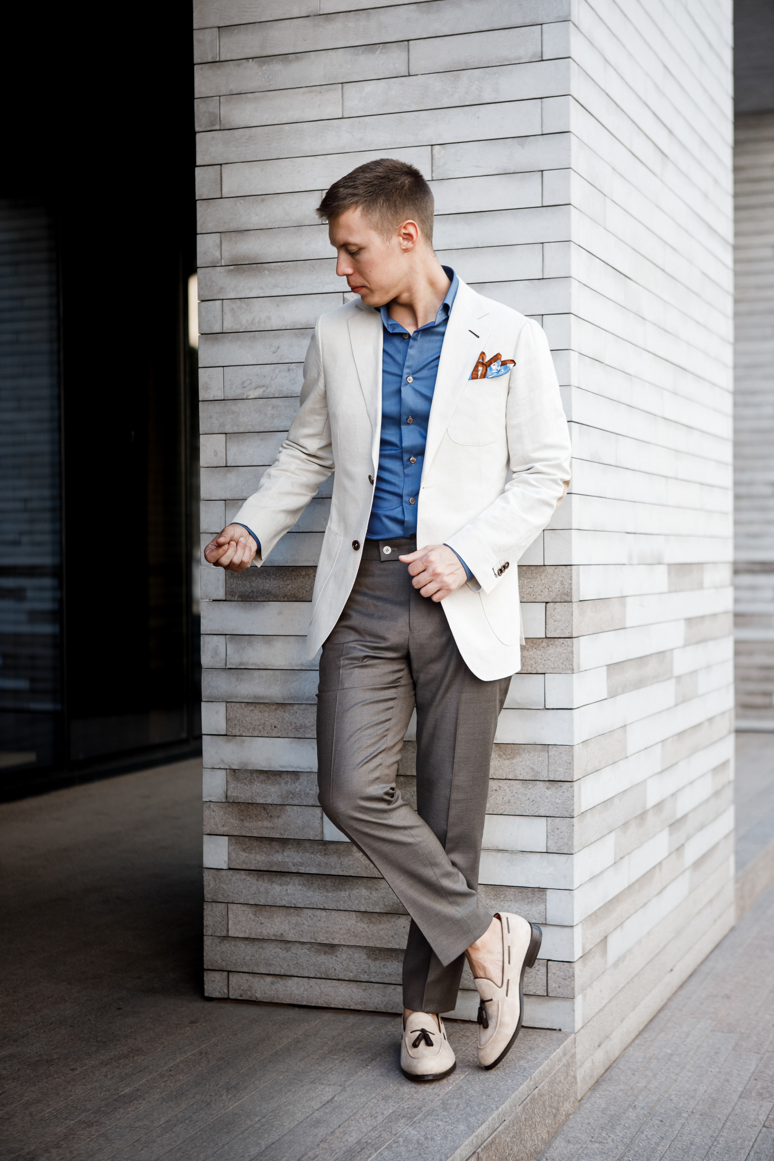 Светлый летний пиджак отражает солнечный свет и притягивает восторженные взгляды прохожих. Испытайте на себе!