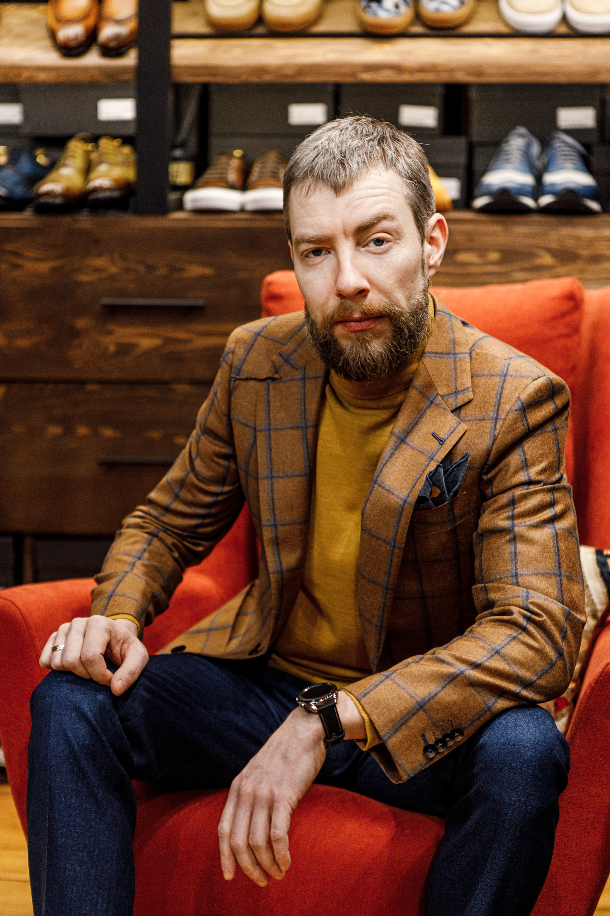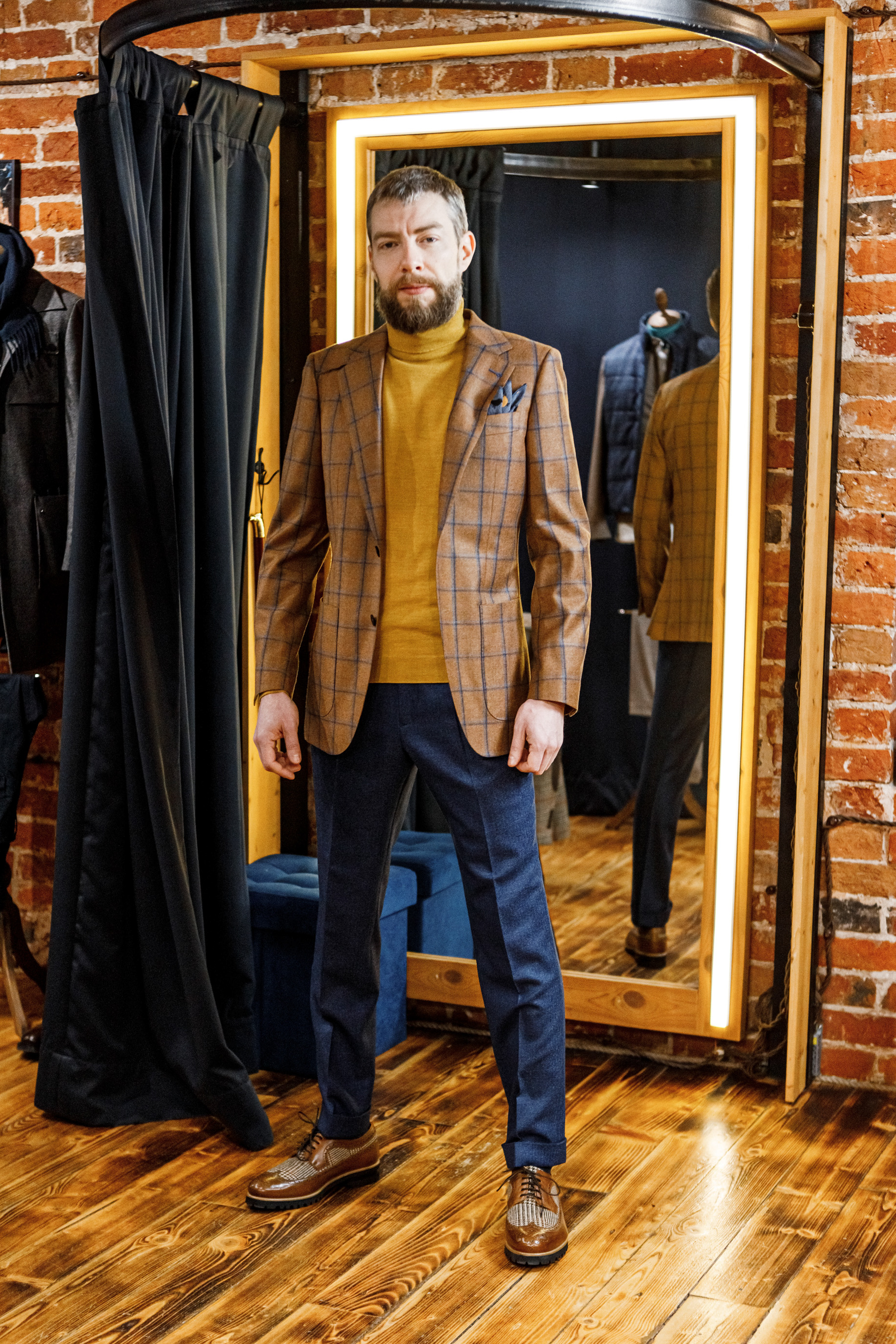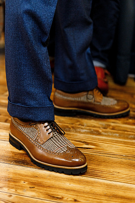Пиджак из фланели от неаполитанского бренда Ariston, кашемировый бадлон, непарные брюки с защипами и комбинированные броги – мельчайшая проработка фактур от стилистов Just In Time.