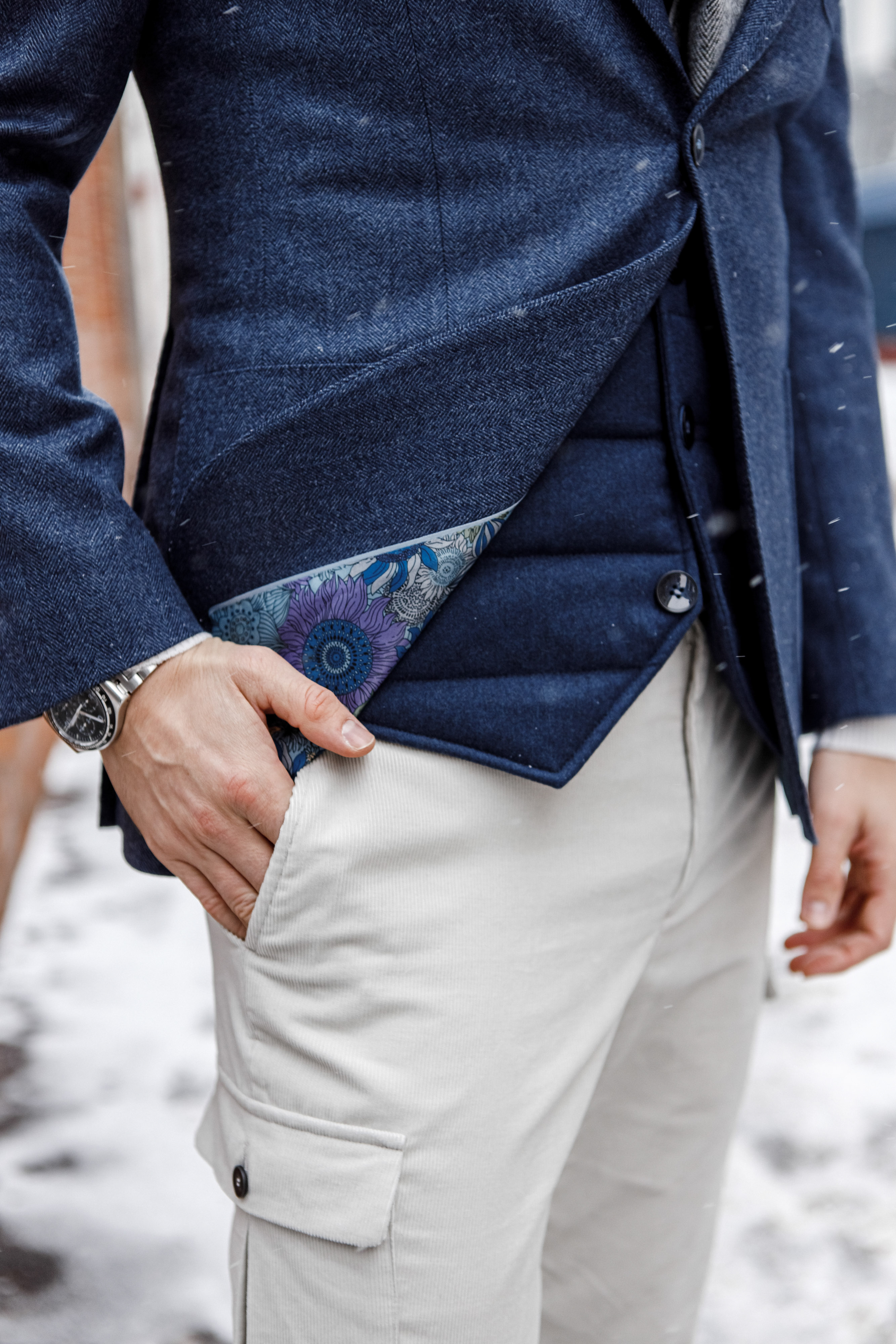 Пиджак из теплой фланели от итальянской мануфактуры StylBiella, стеганый жилет, брюки-карго из микровельвета и Челси-спорт – фактуры материалов так гармонично дополняют друг друга, что хочется танцевать.