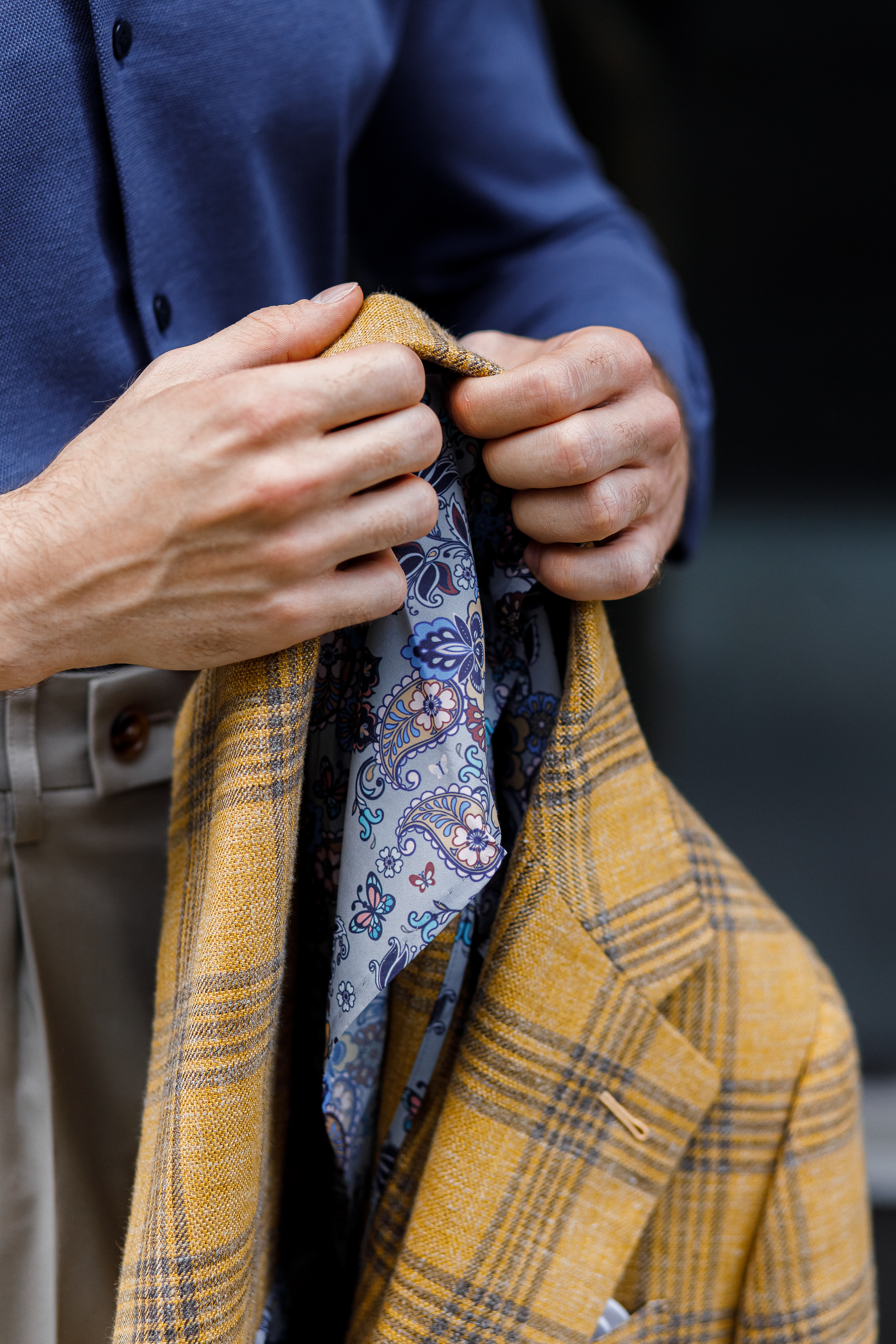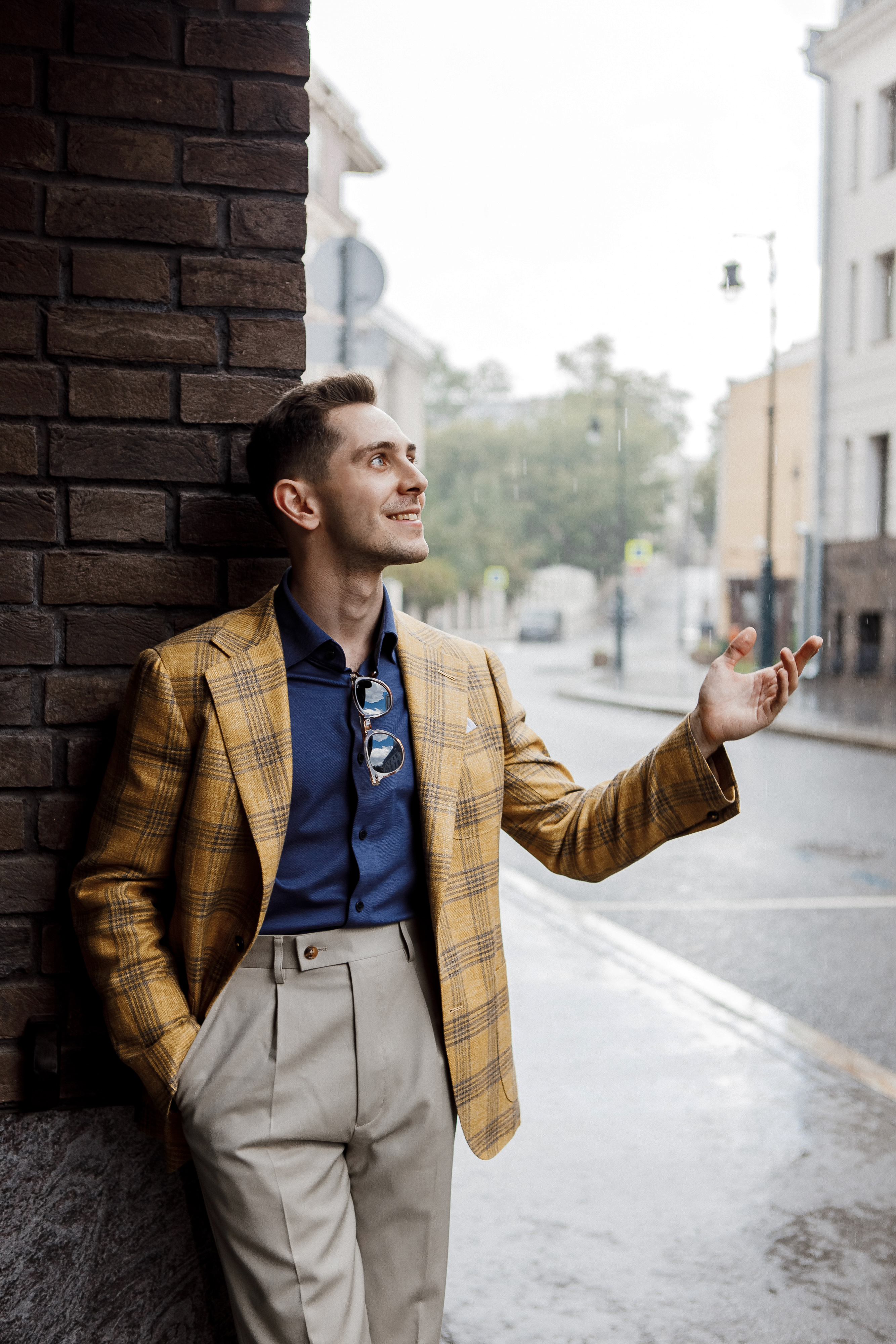 Пиджак из смесовой ткани итальянского бренда Stylbiella с сочетанием шёлка, хлопка и шерсти в оттенке тёплой охры с выразительной графичной клеткой. Охра — это цвет солнца и нагретых улиц. Оттенок дней, которые хочется проживать медленно – и красиво.