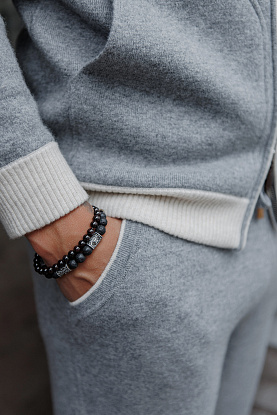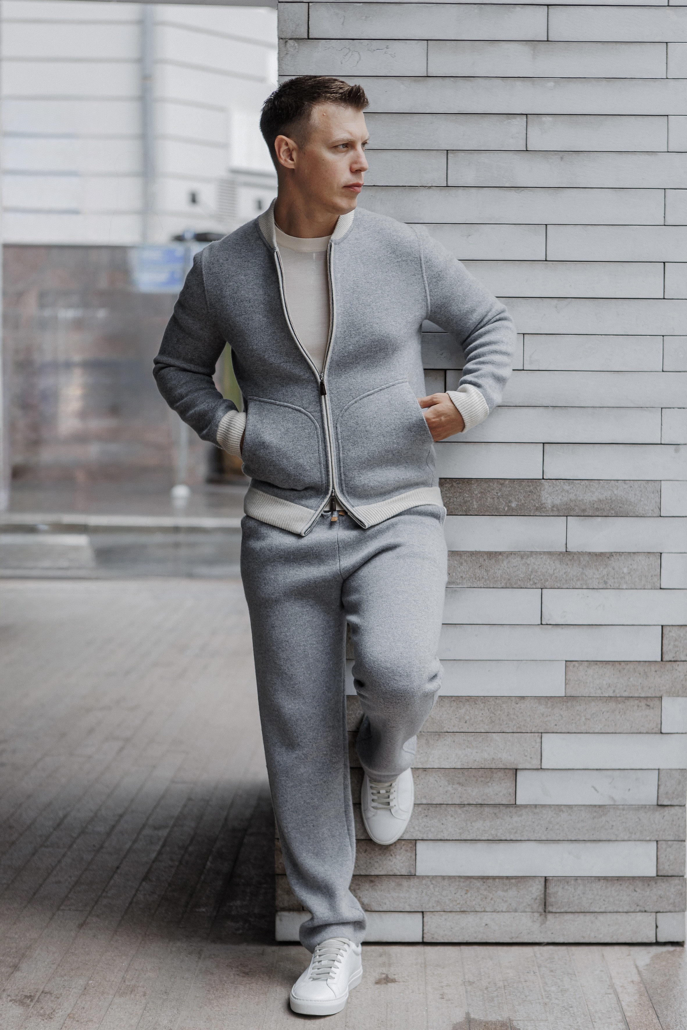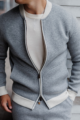 Костюм из мягкого кашемира в благородном сером оттенке, который одинаково уместен дома, в городе или путешествии. Бомбер на молнии с аккуратными карманами, контрастной отделкой манжет и пояса, брюки с прямым, слегка зауженным кроем. Идеальный выбор, когда комфорт становится главным элементом стиля.
