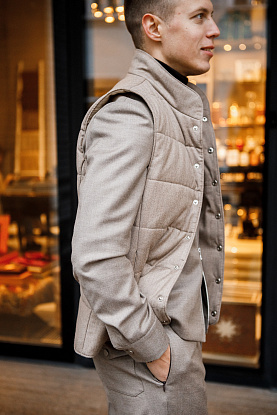 Стеганый жилет из бежевой фланели – стильная функциональность для современного мужчины.