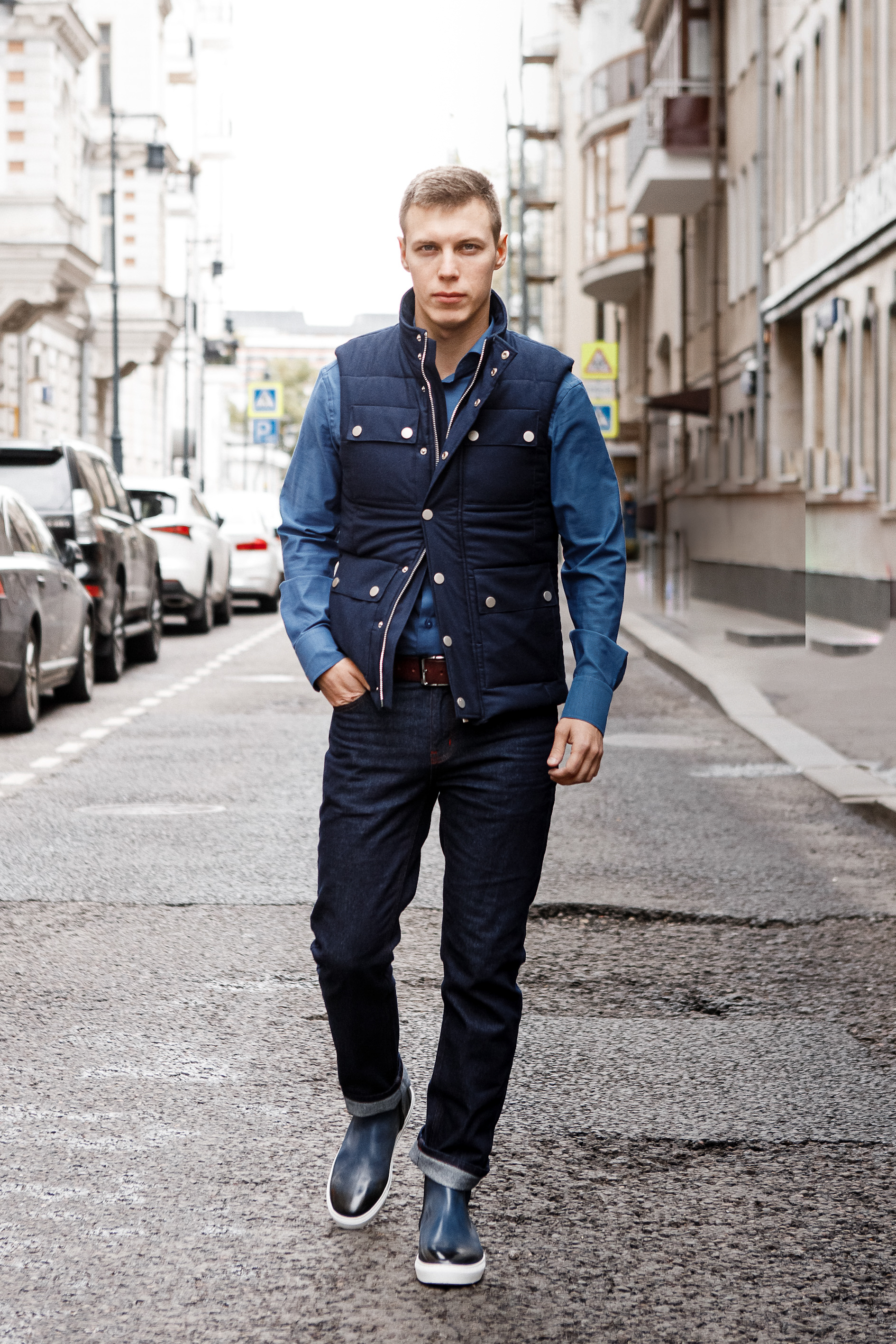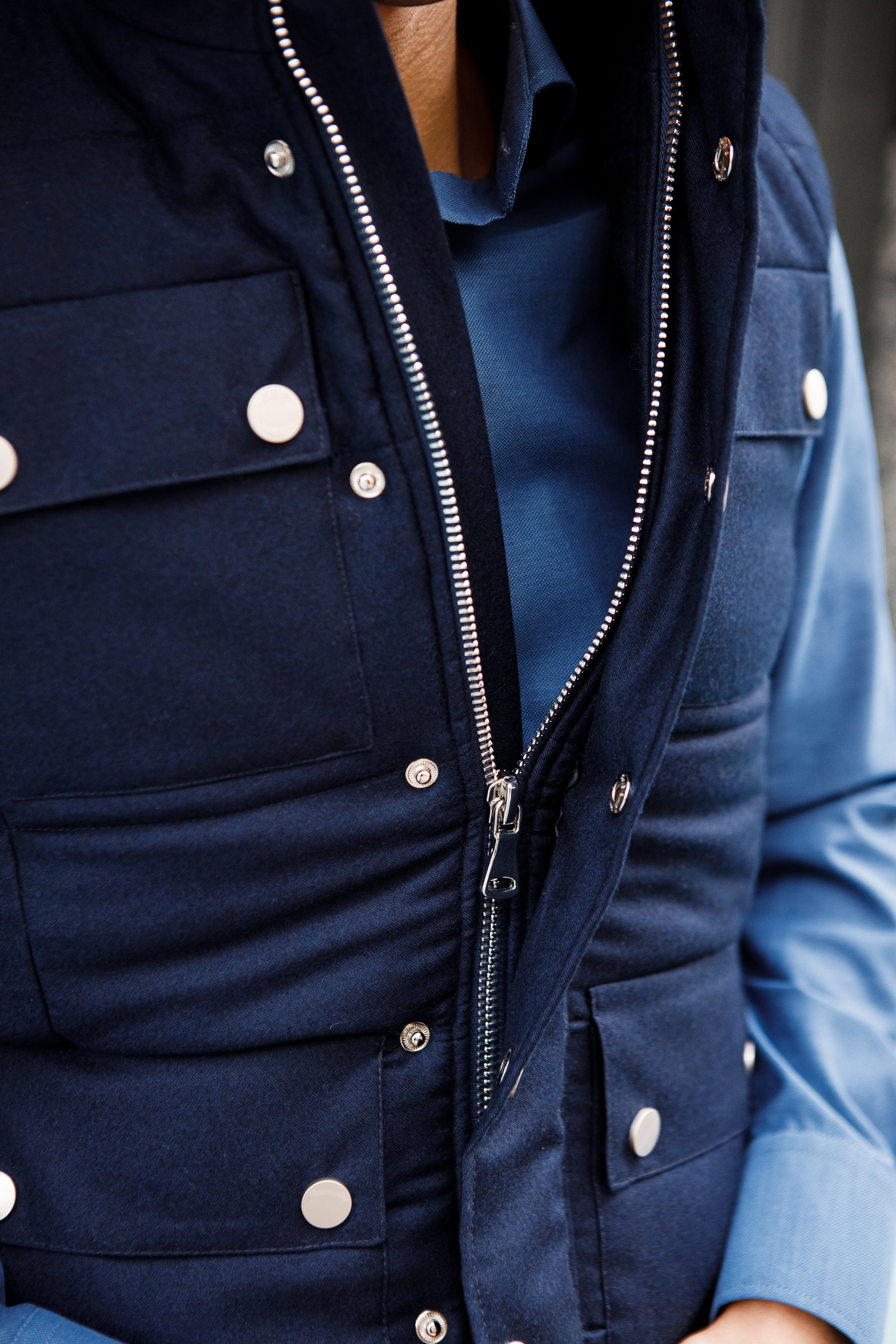 Темно-синий стеганый жилет с вместительными карманами – когда строгие правила делового стиля уступают место практичной функциональности.